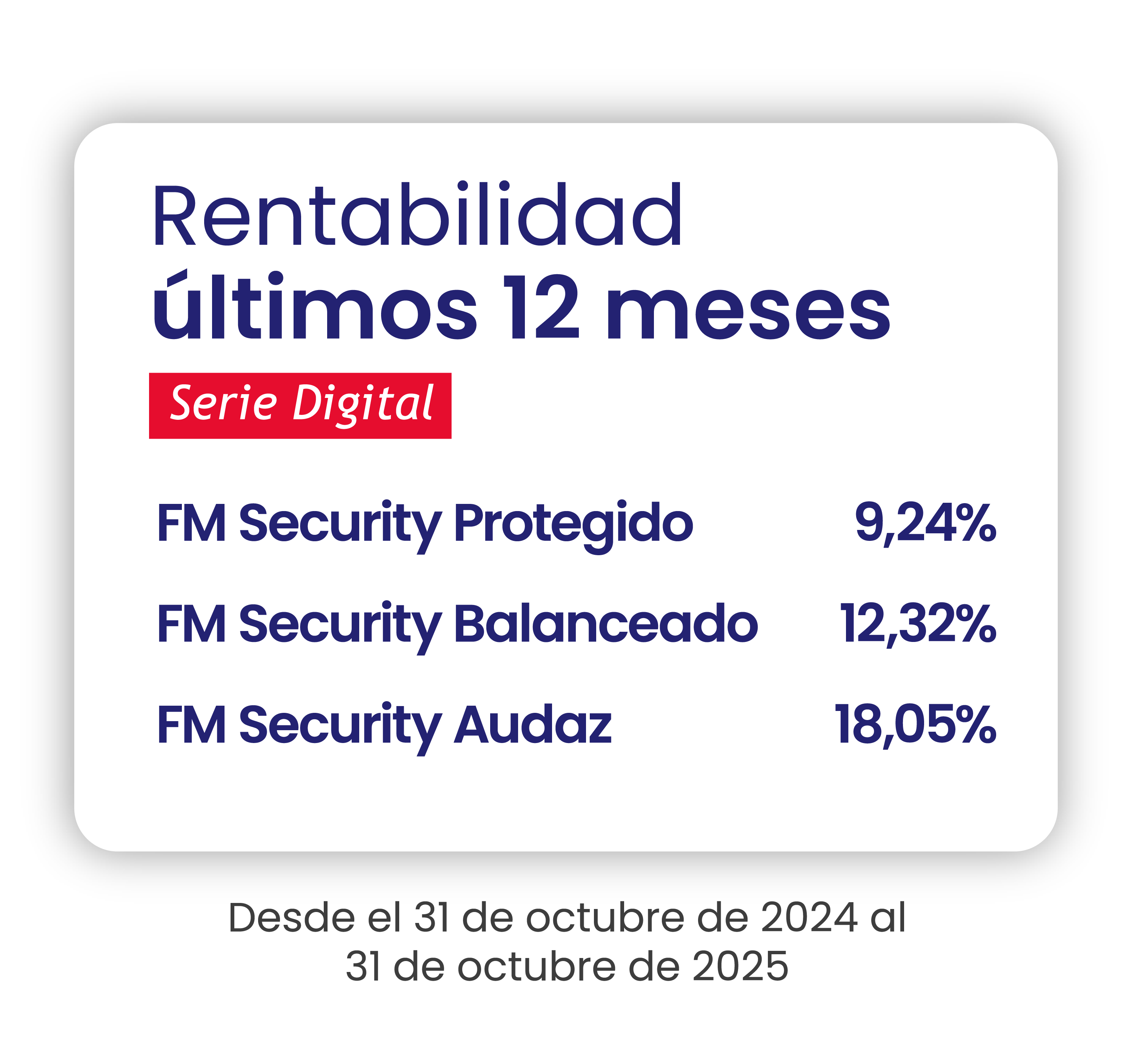 La rentabilidad de los Fondos Mutuos va a depender del activo en los cuales invierte el fondo (renta variable, renta fija o combinación de ambos). Por ello, no se puede asegurar una rentabilidad en la inversión de estos fondos ya que depende de las fluctuaciones de los mercados. Puedes revisar la evolución histórica de cada fondo para que puedas elegir de acuerdo a tu perfil de inversionista. Al hacer clic en cualquier fondo, accedes a toda su información histórica en los últimos 12 meses.