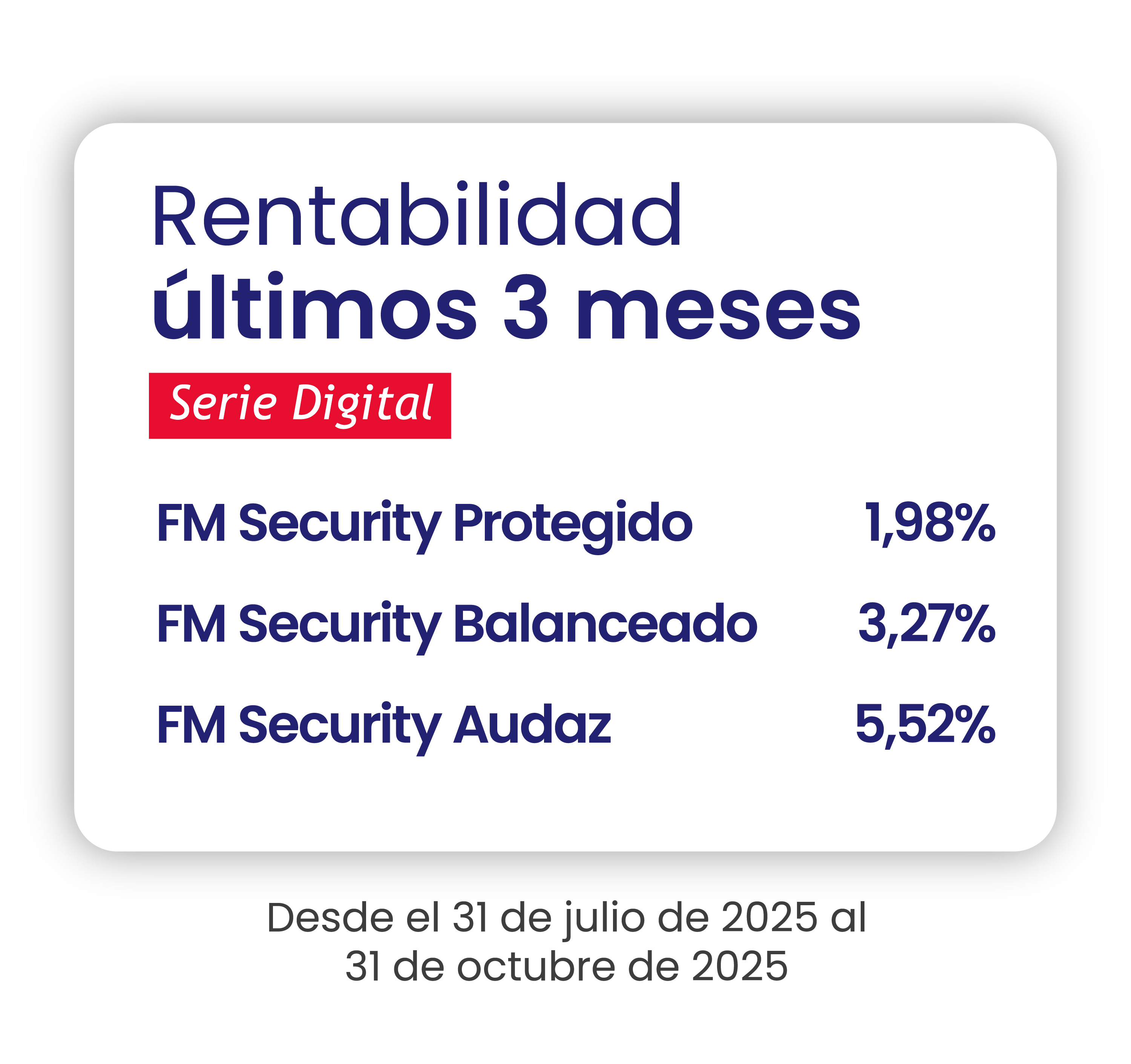 Infórmese de las características esenciales de la inversión en estos fondos mutuos, las que se encuentran contenidas en su reglamento interno y contrato de suscripción de cuotas. Las rentabilidades o ganancias obtenidas por los fondos mutuos administrados por esta sociedad, no garantizan que ellas se repitan en el futuro. Los valores de las cuotas de fondos mutuos son variables.